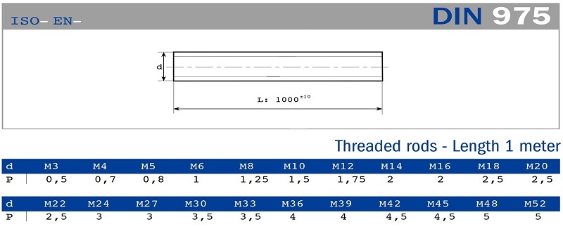 Ty ren inox được sản xuất theo tiêu chuẩn kỹ thuật Din 975 của Đức, dưới đây là bảng thông số kỹ thuật của ty ren inox theo tiêu chuẩn Din 975: