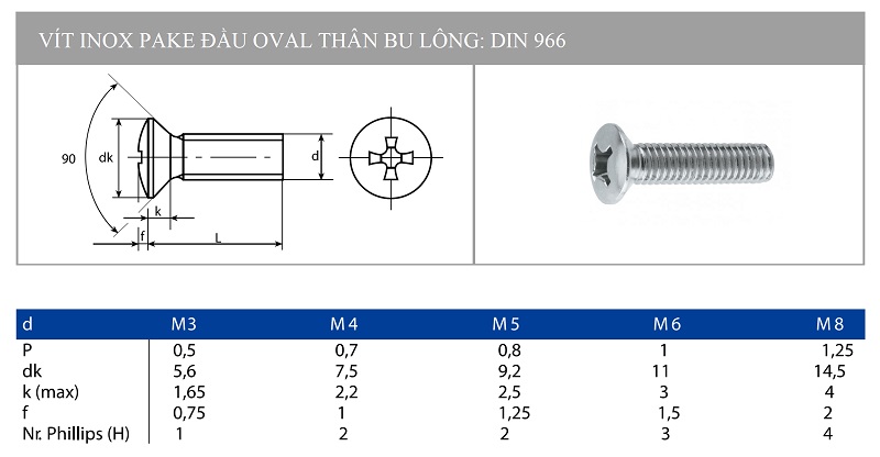 Cấu tạo vít Inox pake đầu oval (ô van) thân bu lông: din 966 gồm 2 phần: đầu vít đầu tròn (đầu cầu) có dập chìm để có thể sử dụng tua vít 4 cạnh để vặn vít, thân vít thông thường có hai dạng ren lửng và ren suốt. Tùy vào công việc và mối ghép có thể chọn thân vít là ren lửng hoặc ren suốt, cũng như chiều dài và đường kính thân vít.